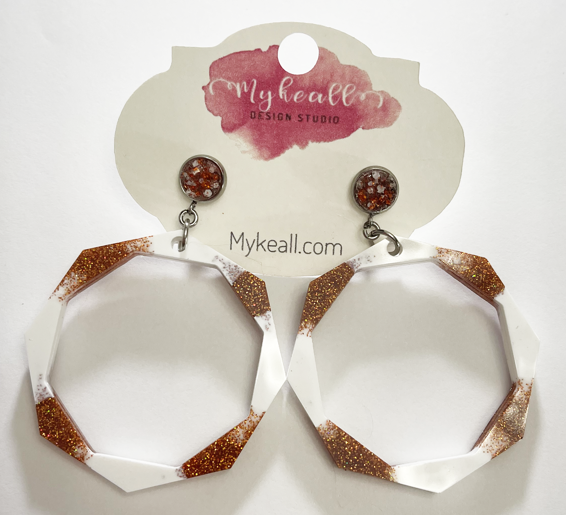 Burnt orange and white hoop earrings with druzy post - 2.5" length