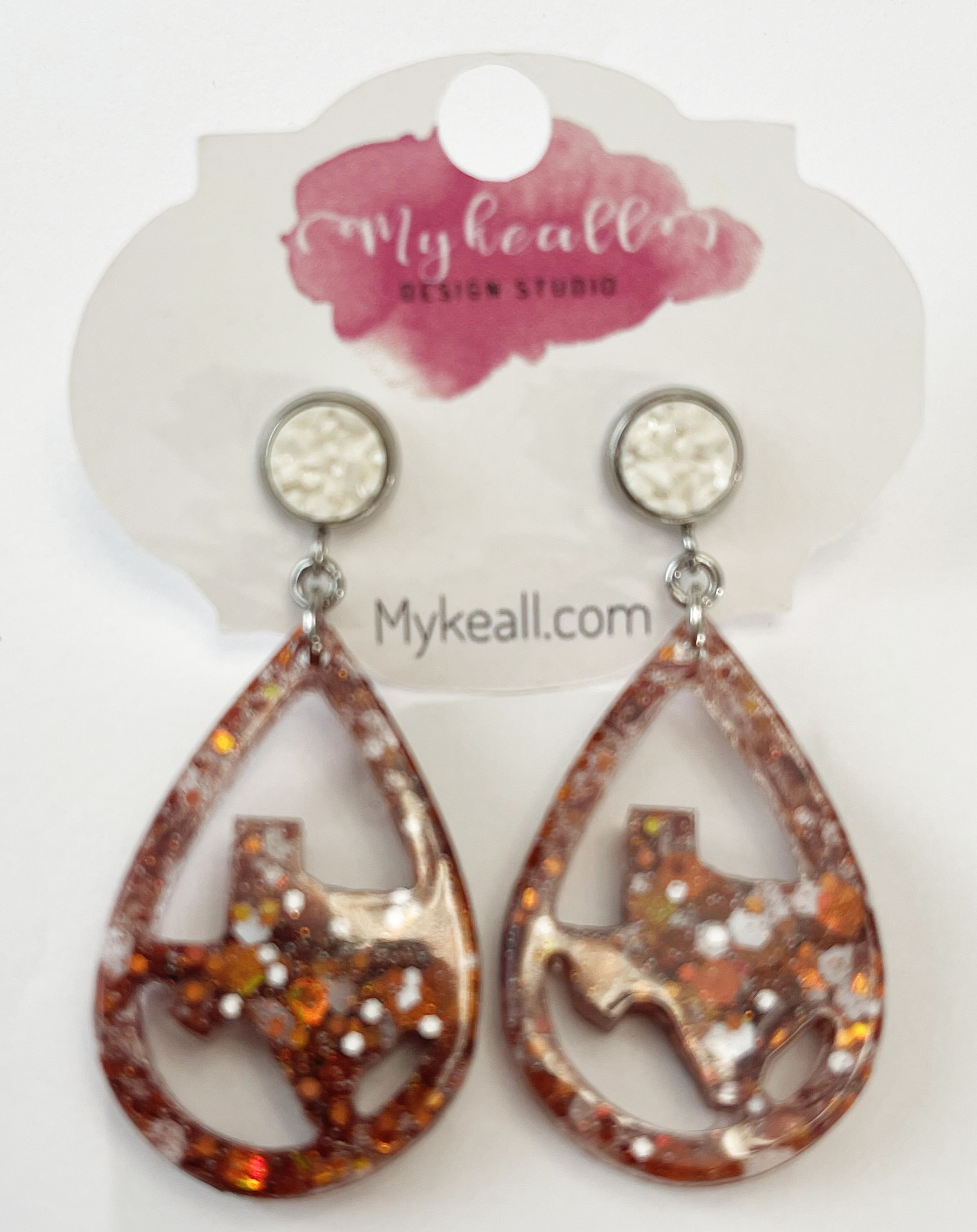 Burnt orange Texas earrings with white druzy post - 2.0" length