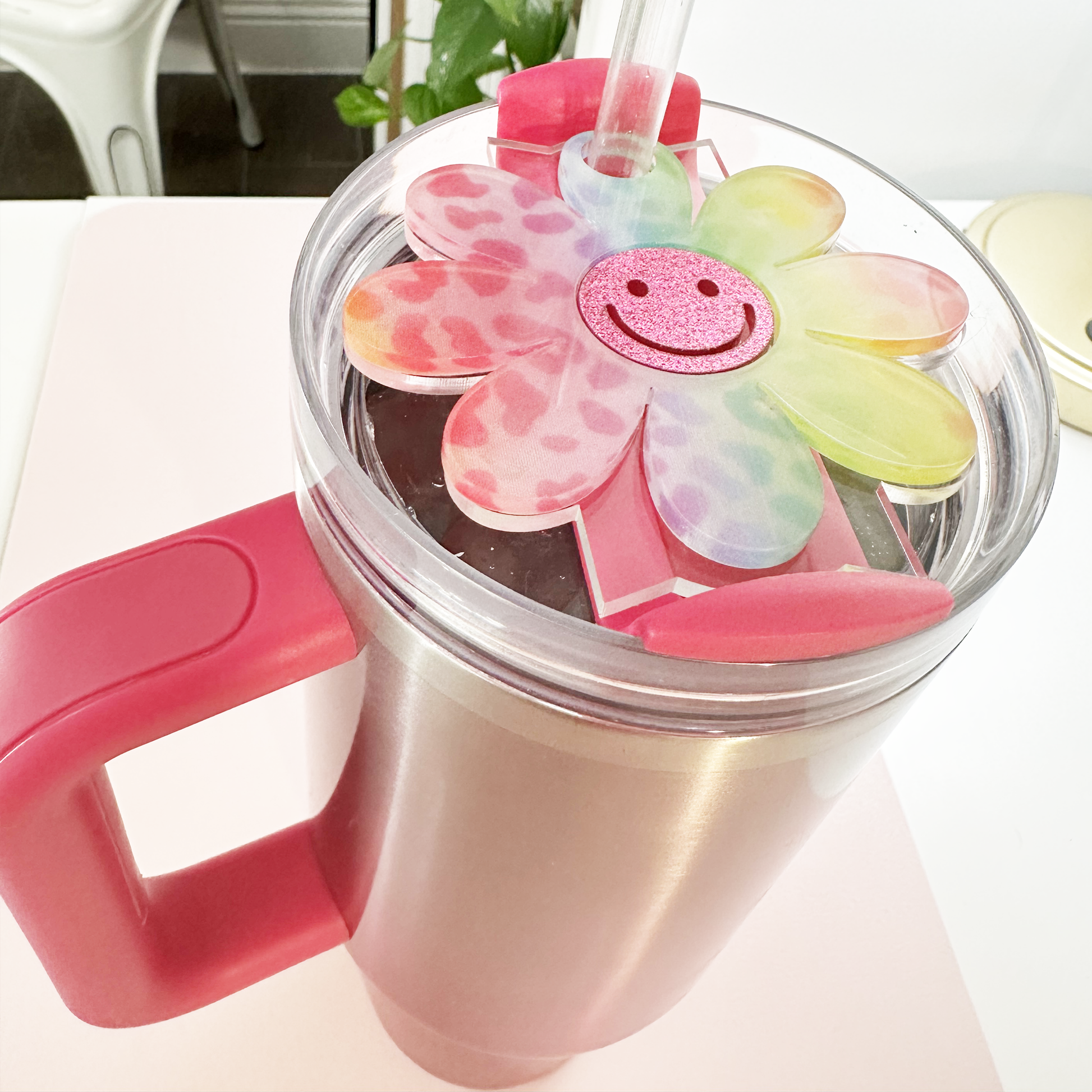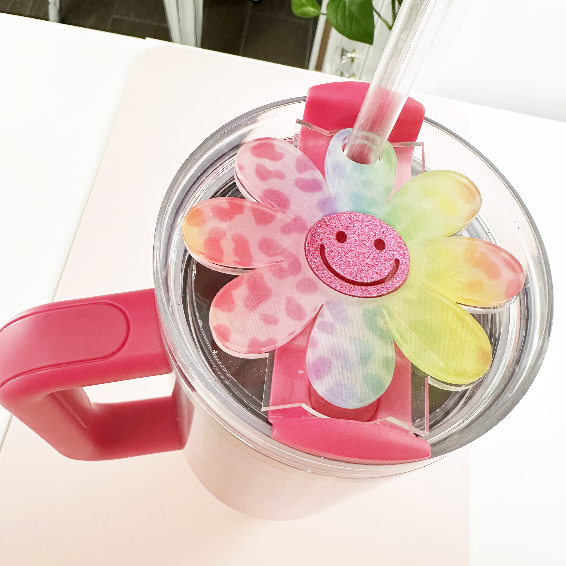 TUMBLER TOPPER TAG - RAINBOW CHEETAH SMILEY FLOWER