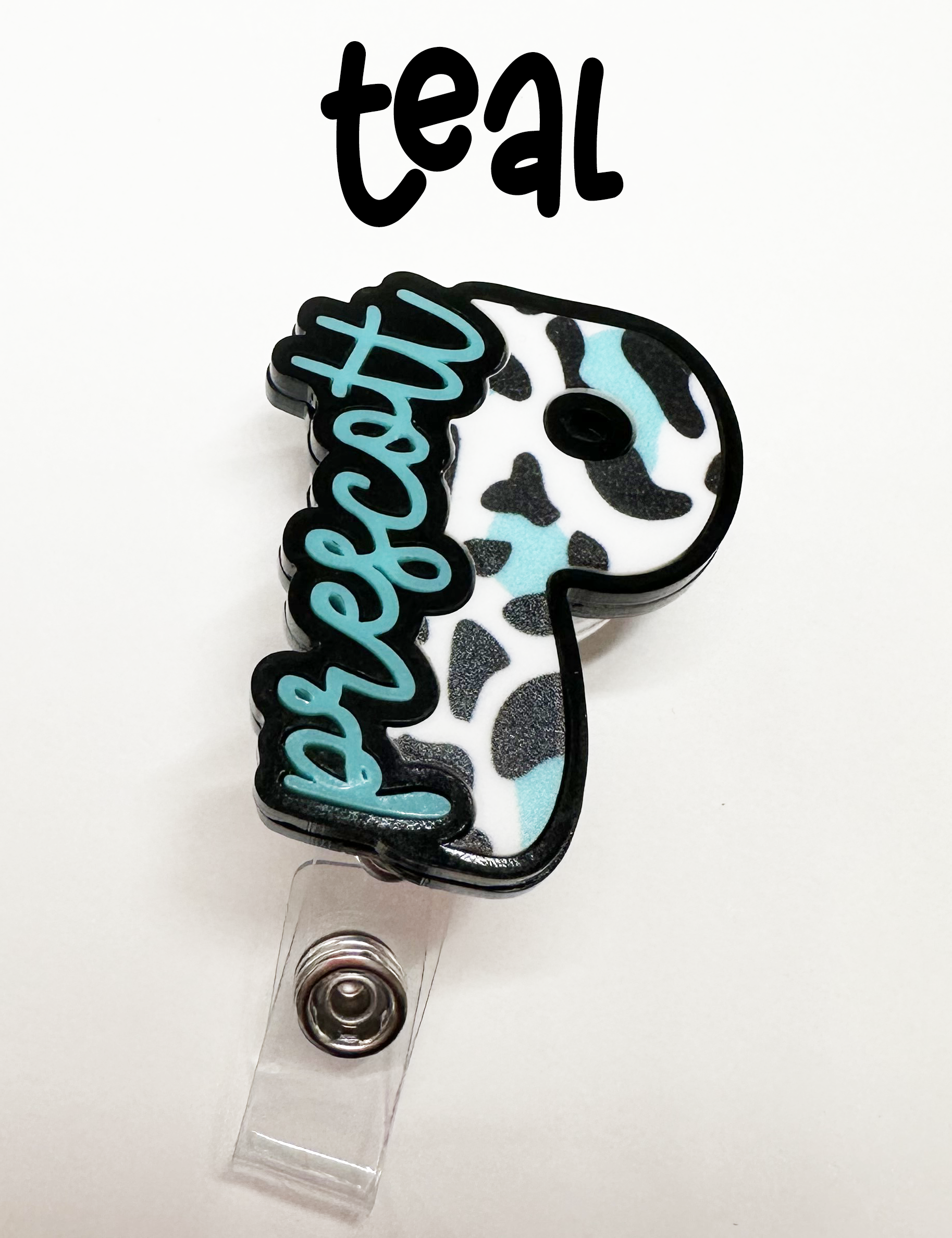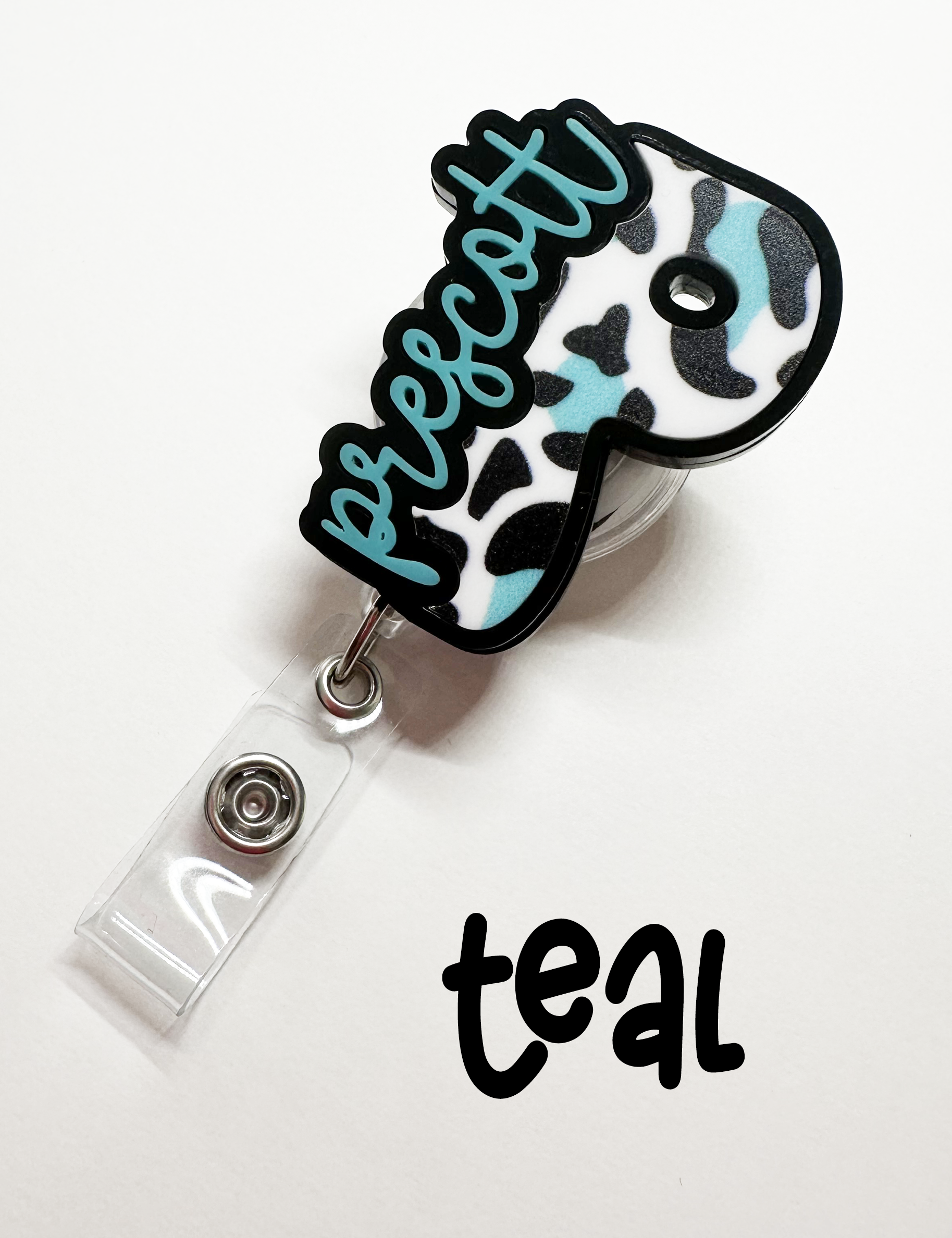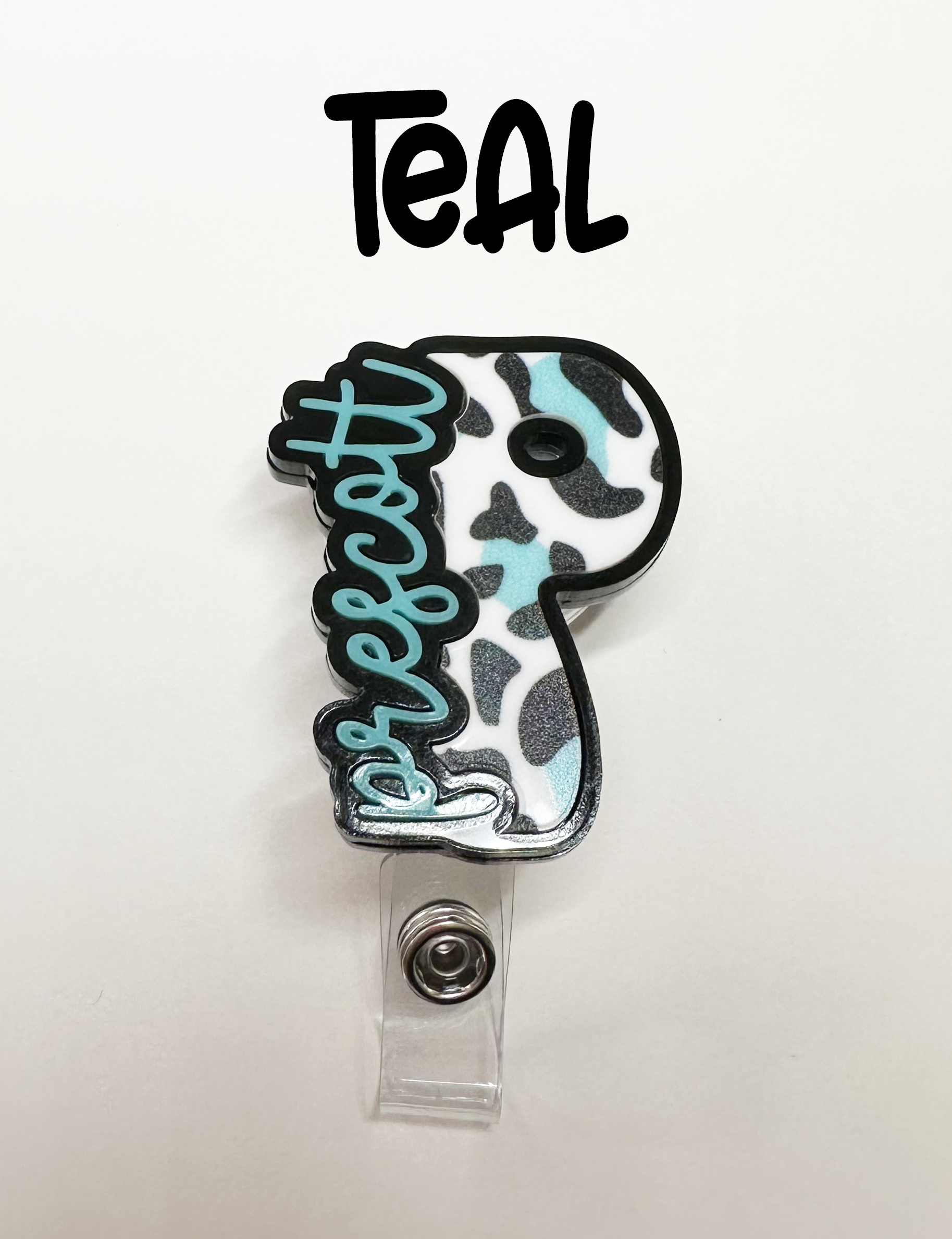 The custom acrylic name with initial is 2"x2" in size and is attached to the badge reel. The reel is clear with a 34” retractable cord and an alligator swivel clip.