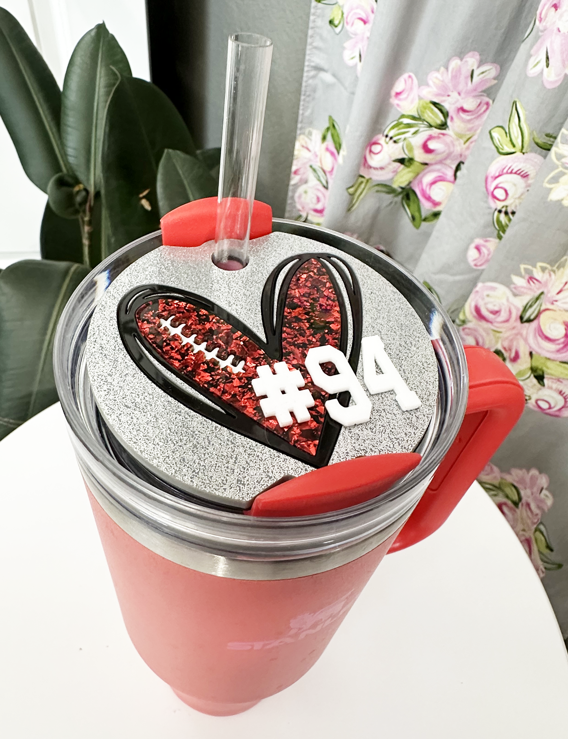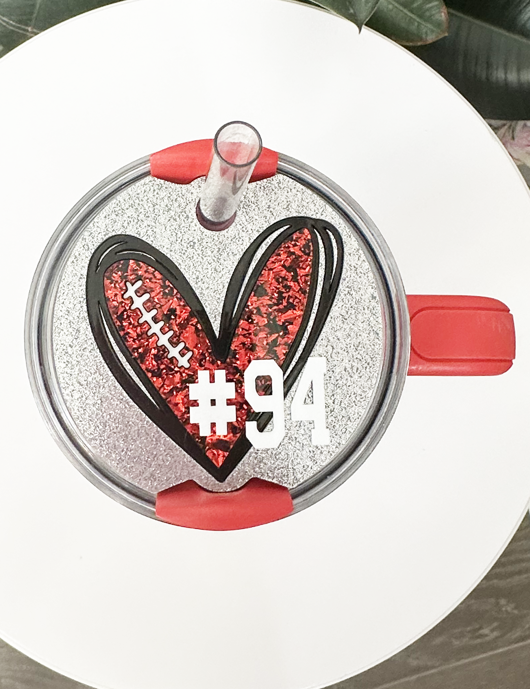 CUSTOM TUMBLER TOPPER - FULL LID - FOOTBALL HEART WITH TEAM NUMBER