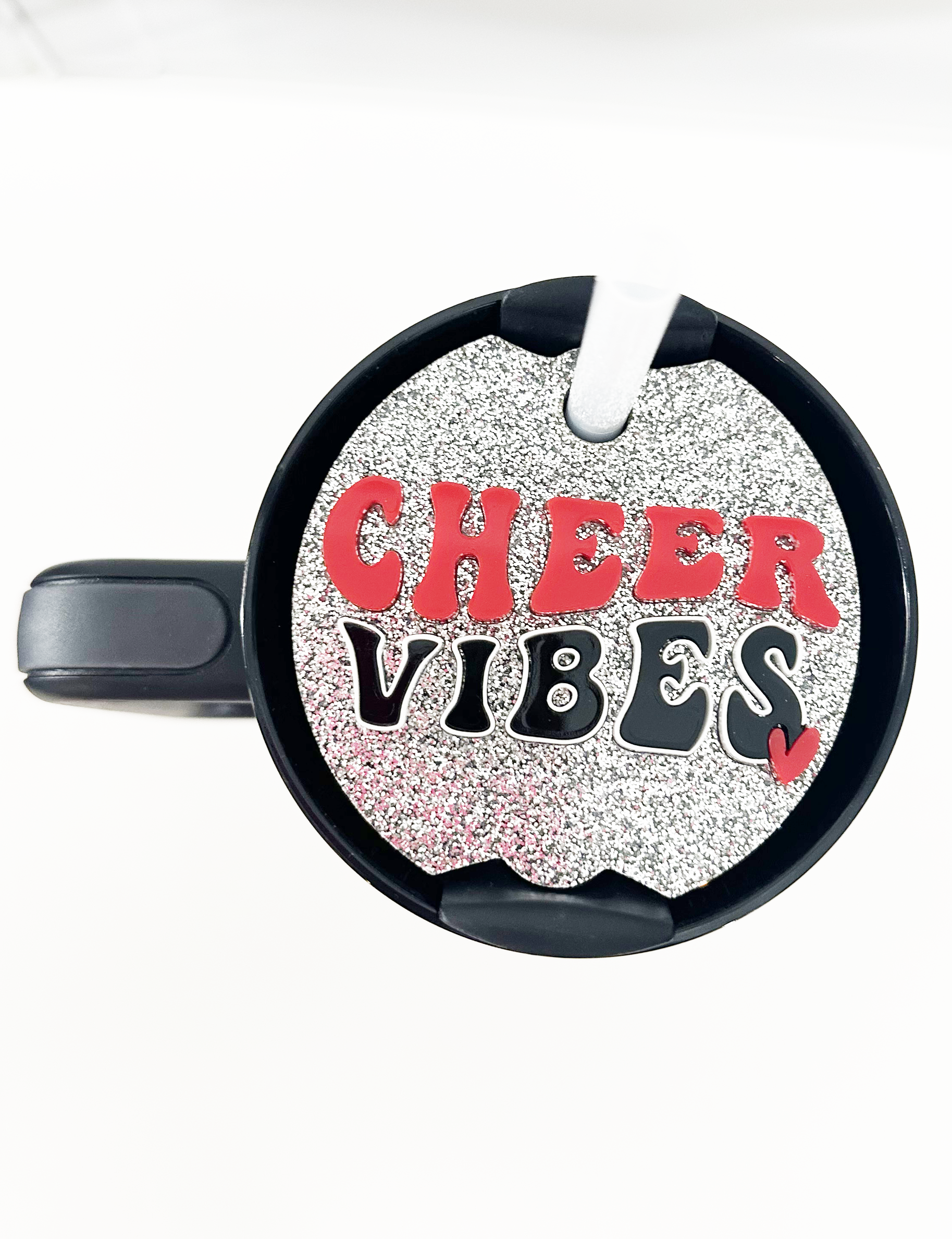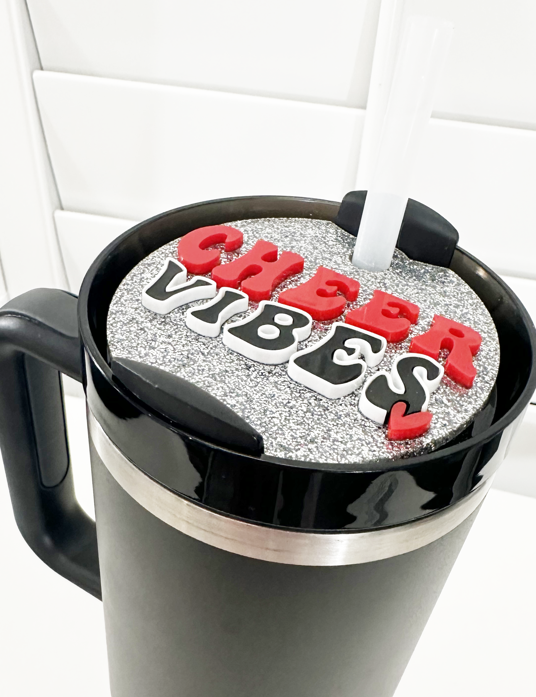 CUSTOM TUMBLER TOPPER - FULL LID - CHEER VIBES-SLVR GLTR