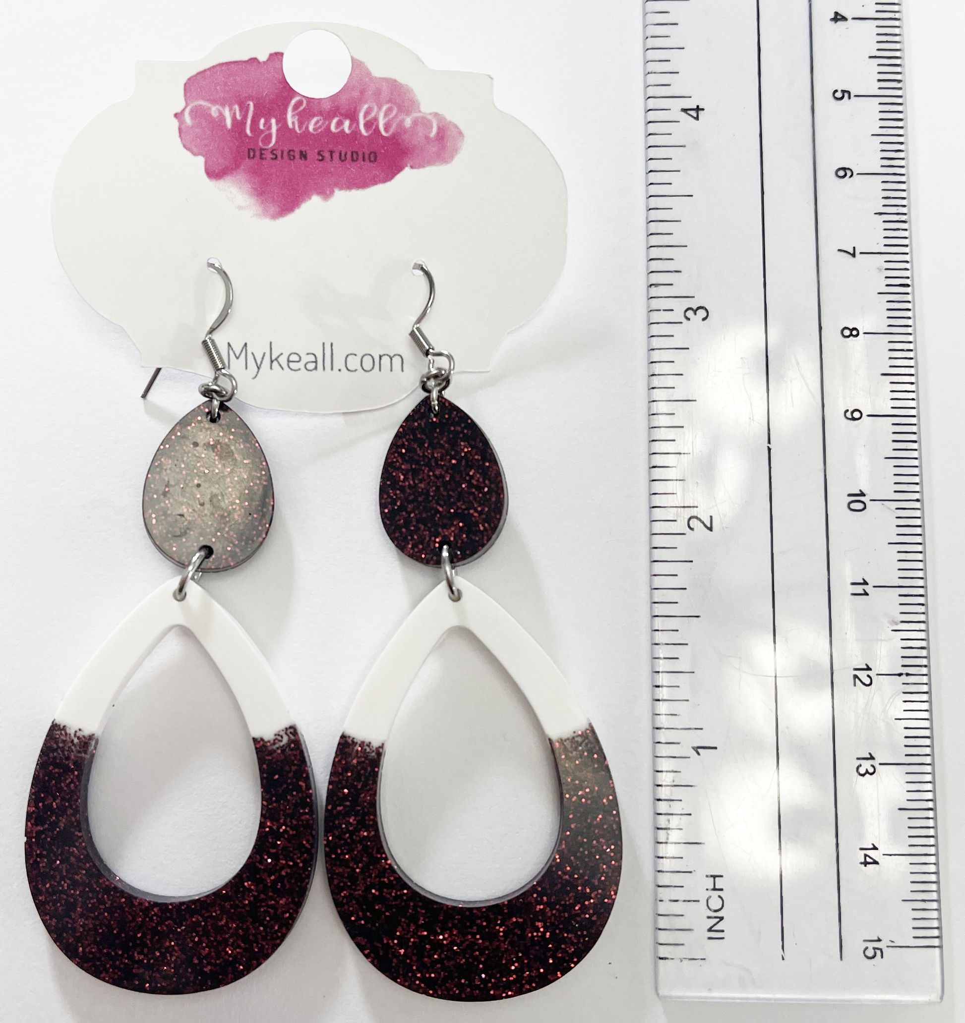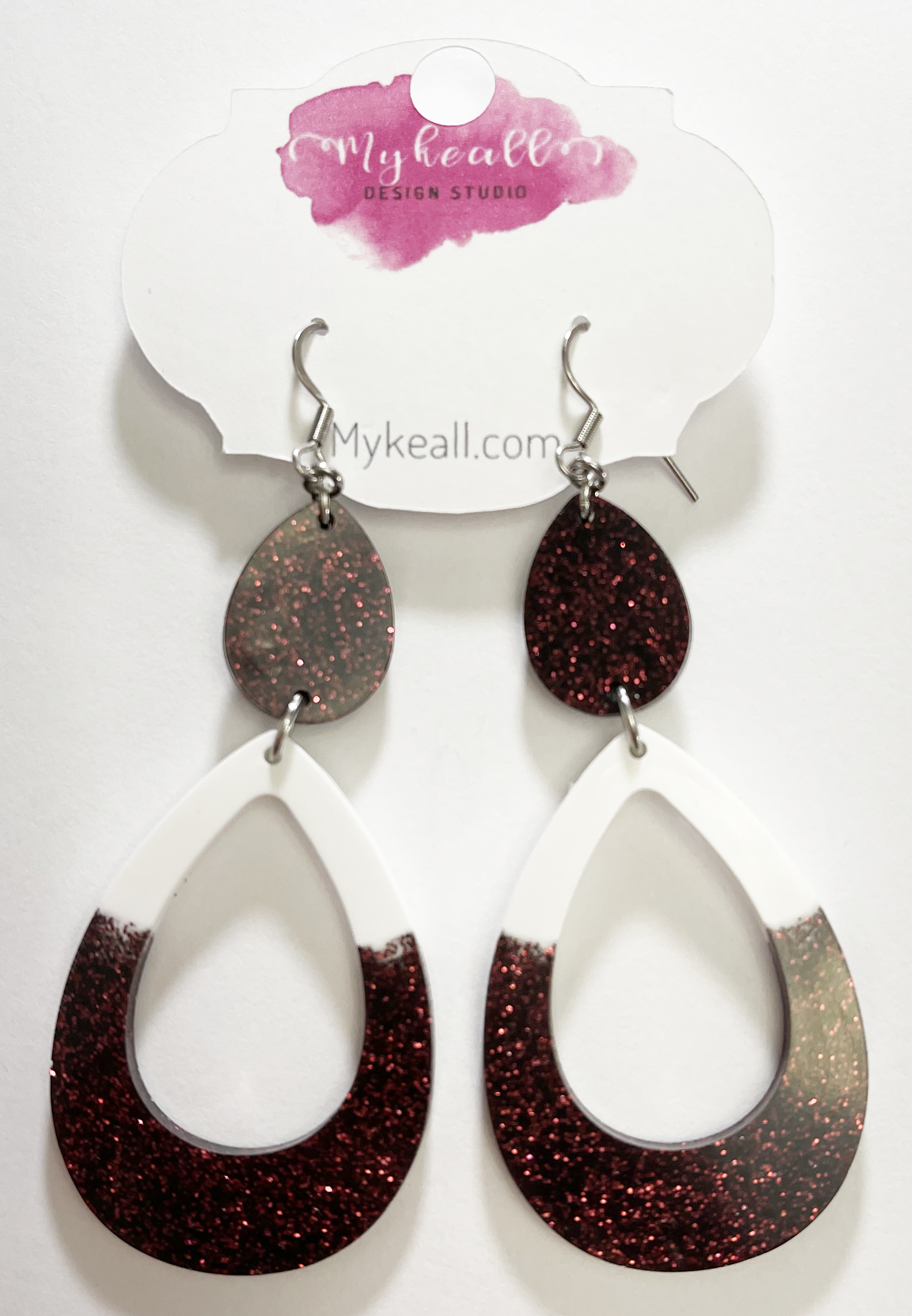 Teardrop dangle earrings with maroon glitter and solid white - 3.0" length
