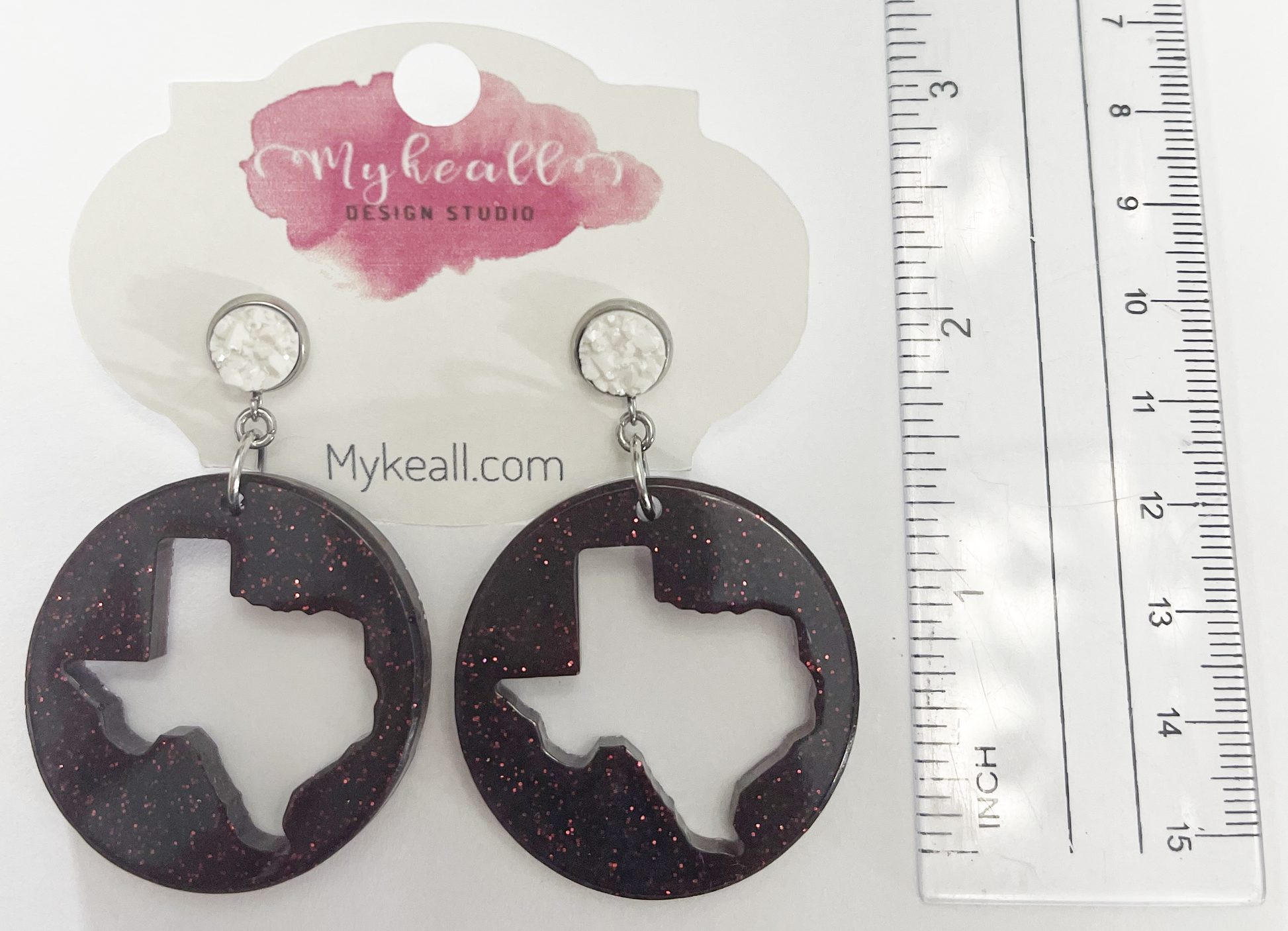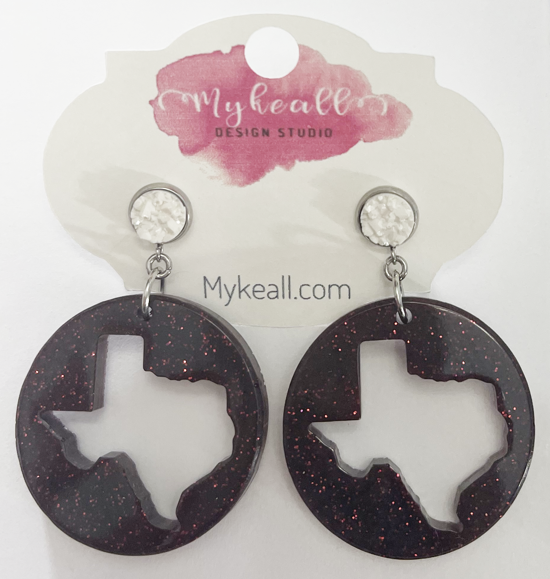 Texas cut out drop earrings in maroon glitter with white druzy post - 2" length