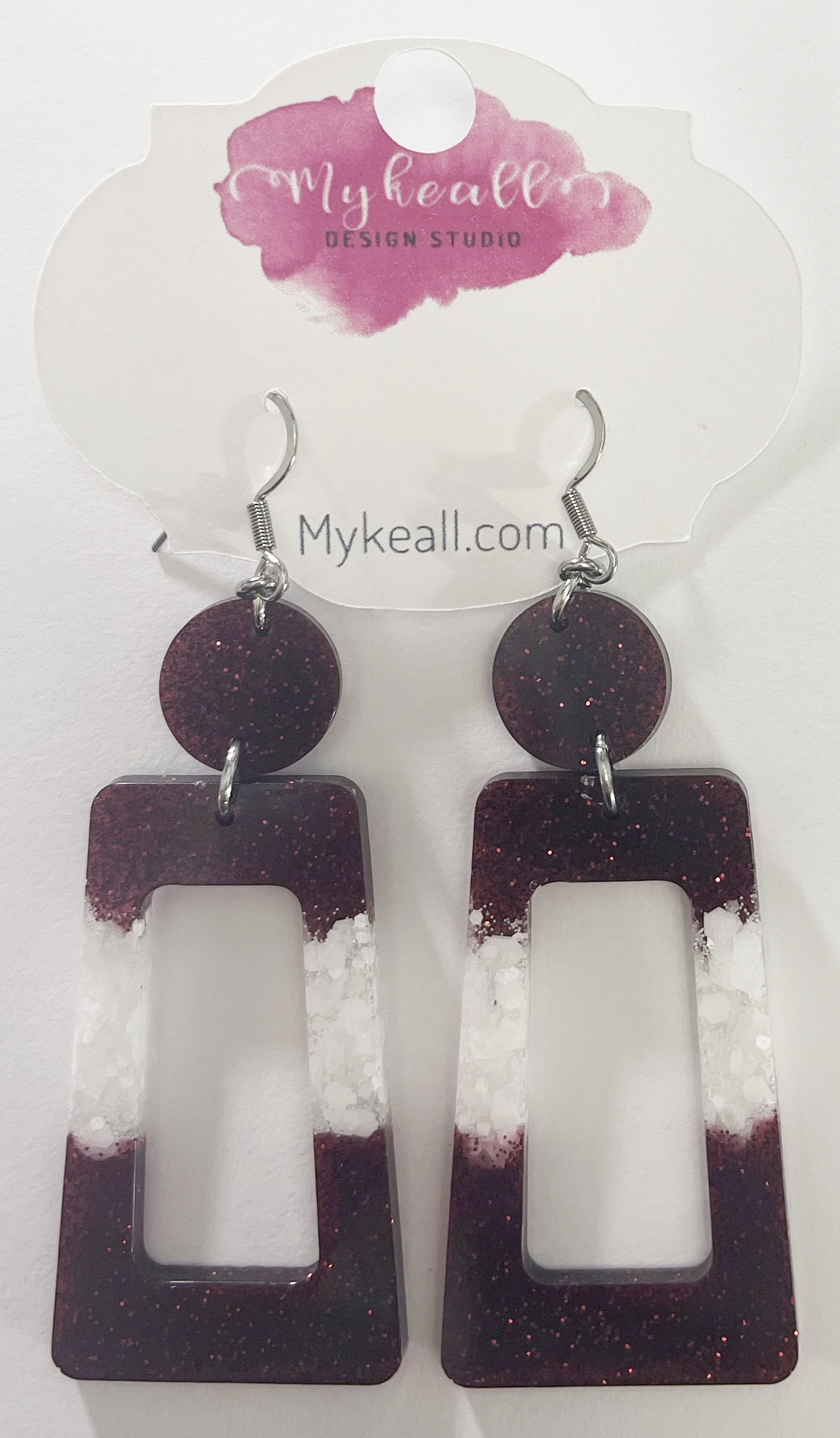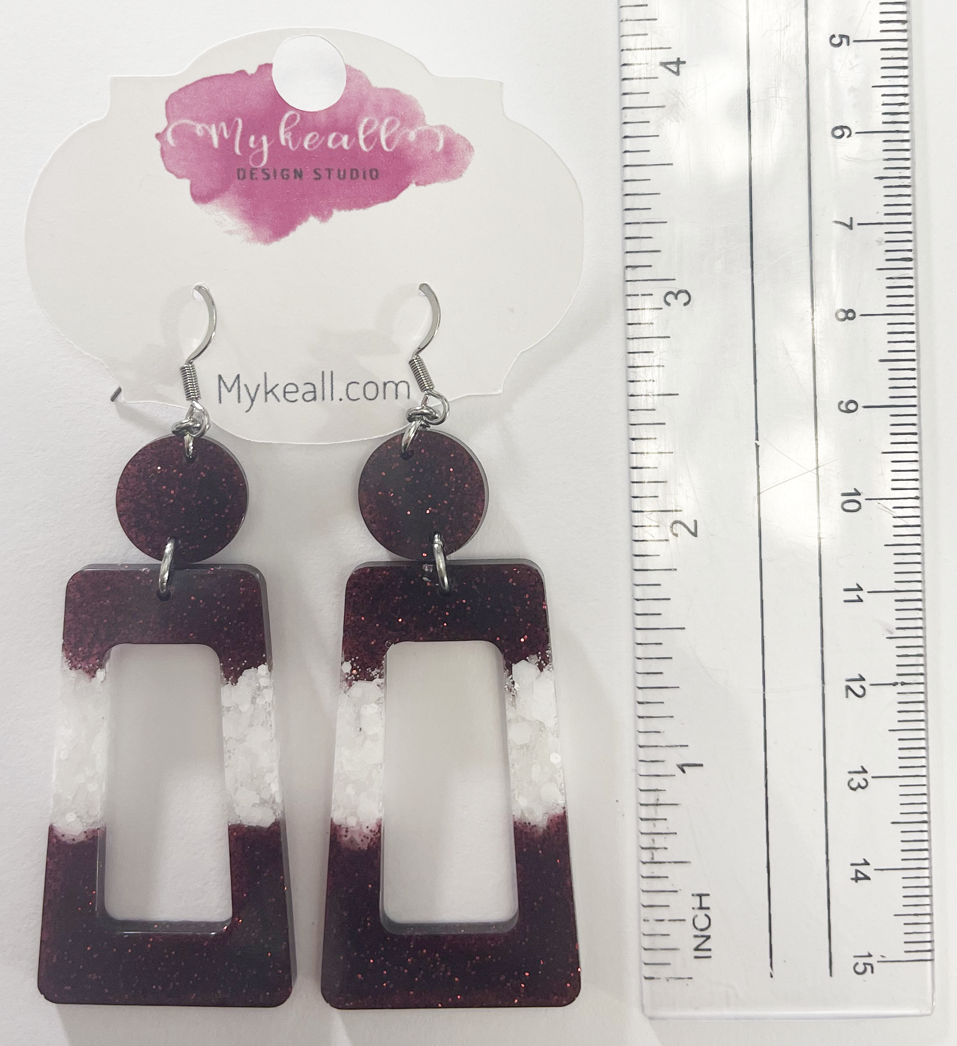 Octangular drop earrings in maroon with white chunky glitter - 3" length