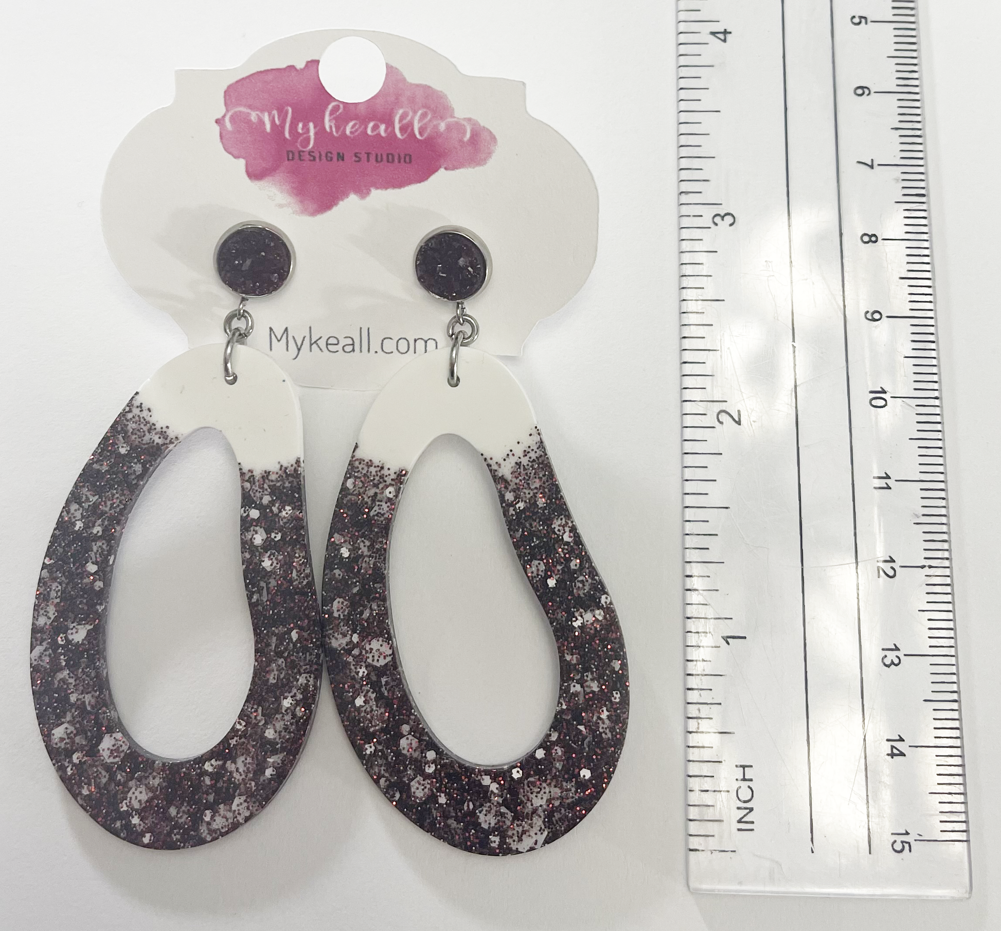 Oval drop earrings in maroon & white glitter mix, solid white with maroon druzy post - 3" length