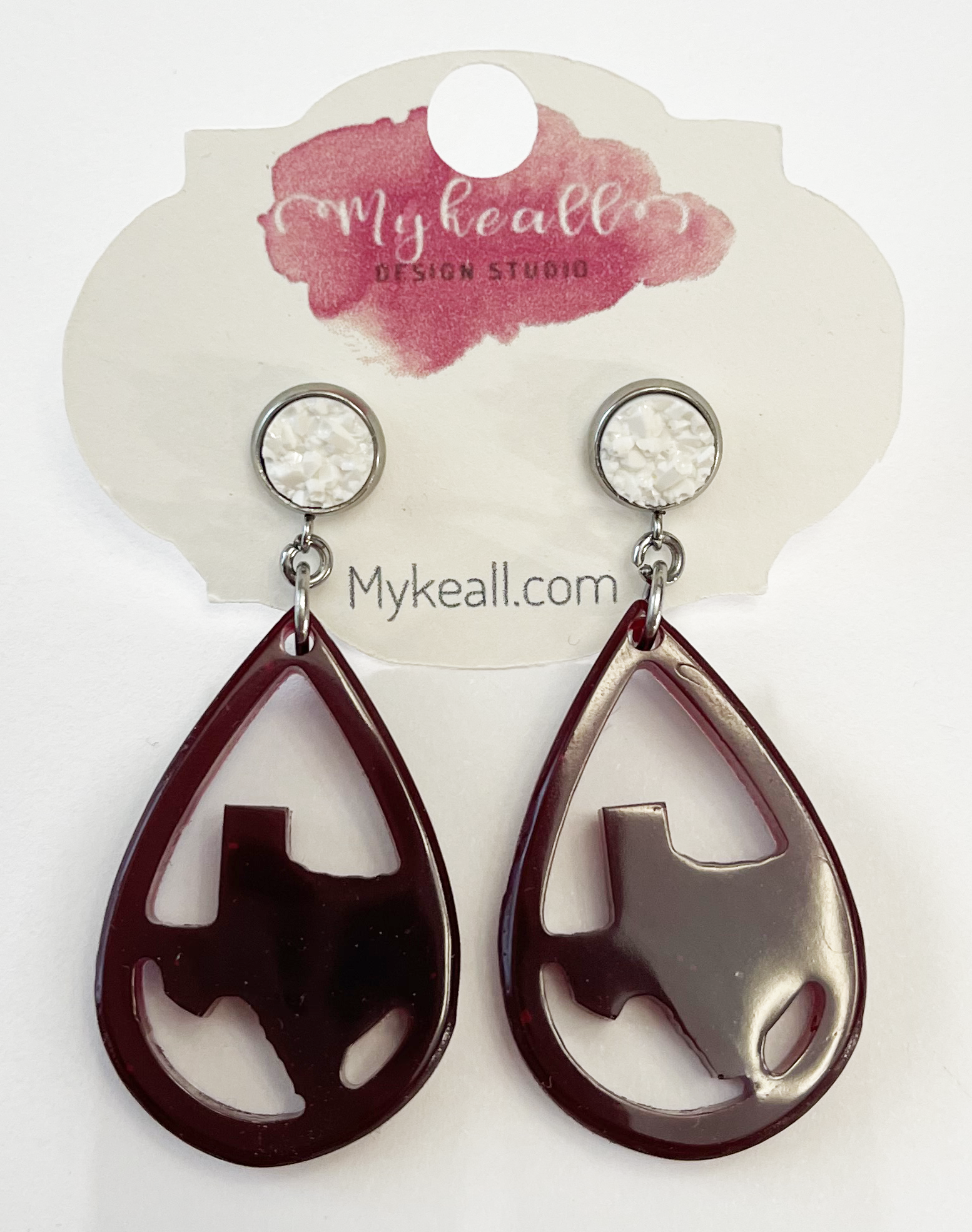 Teardrop Texas earrings in maroon glitter, with solid white druzy post - 2" length