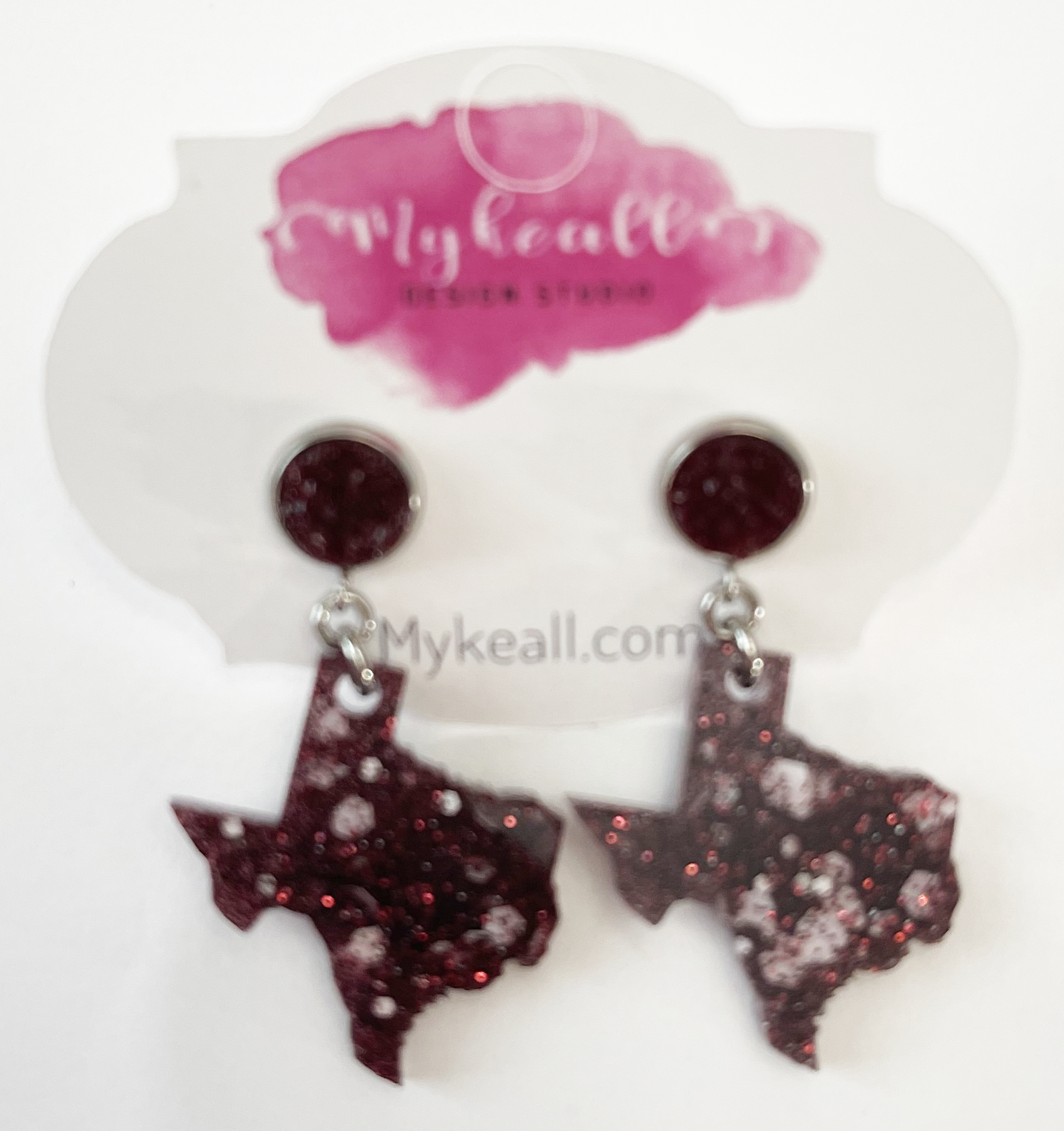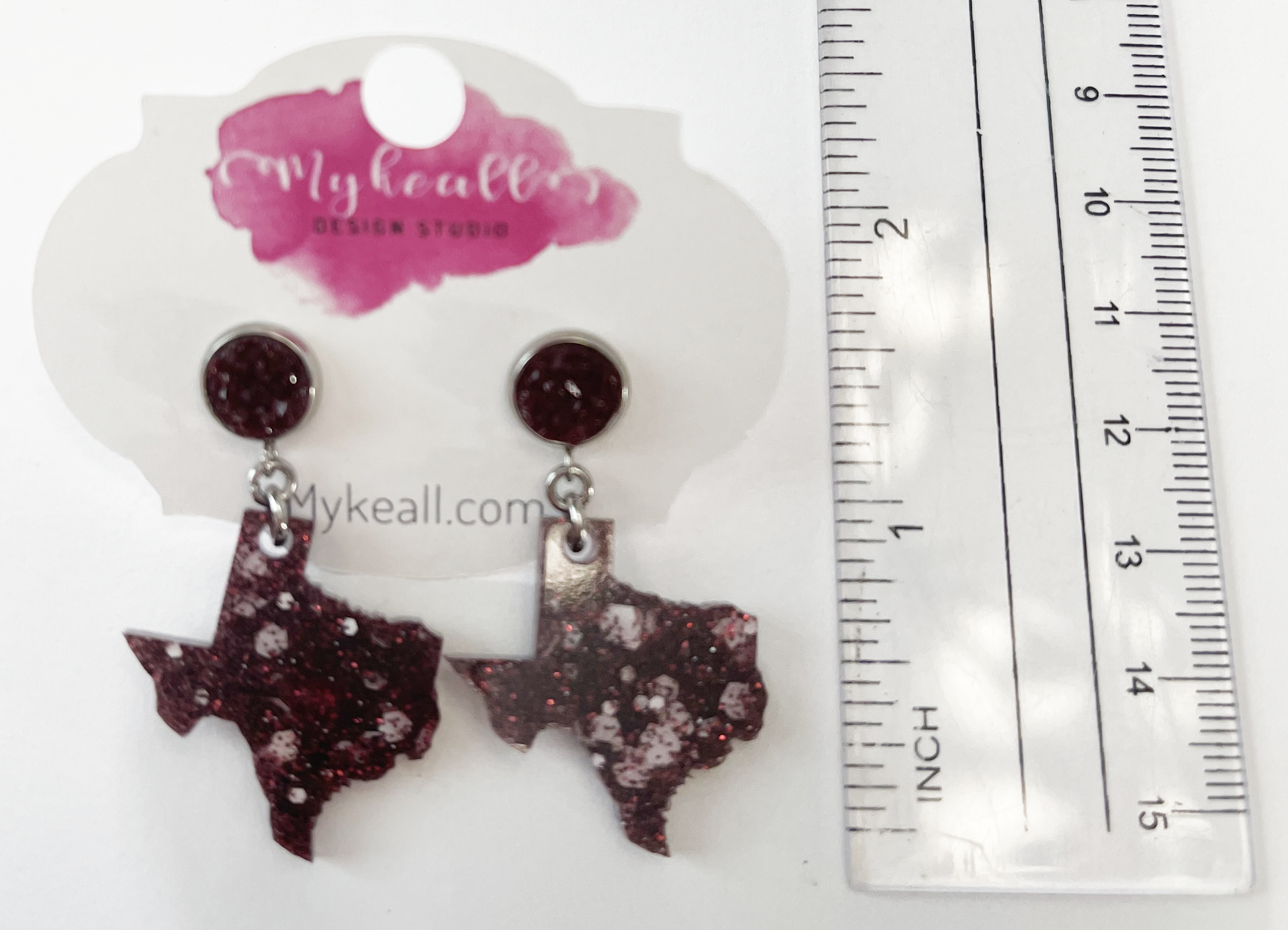 Maroon & white glitter Texas dangle earrings - 1.5" length with maroon druzy post