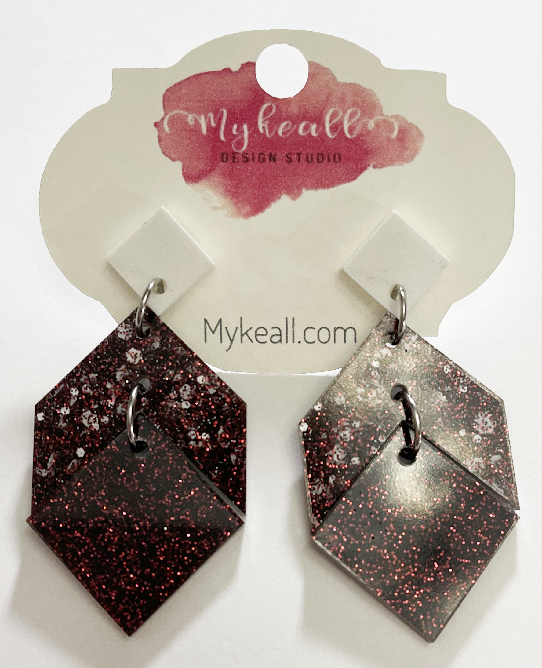 Three piece dangle earrings. Maroon glitter, maroon & white glitter mix & solid white epoxy colors - 2.5" length