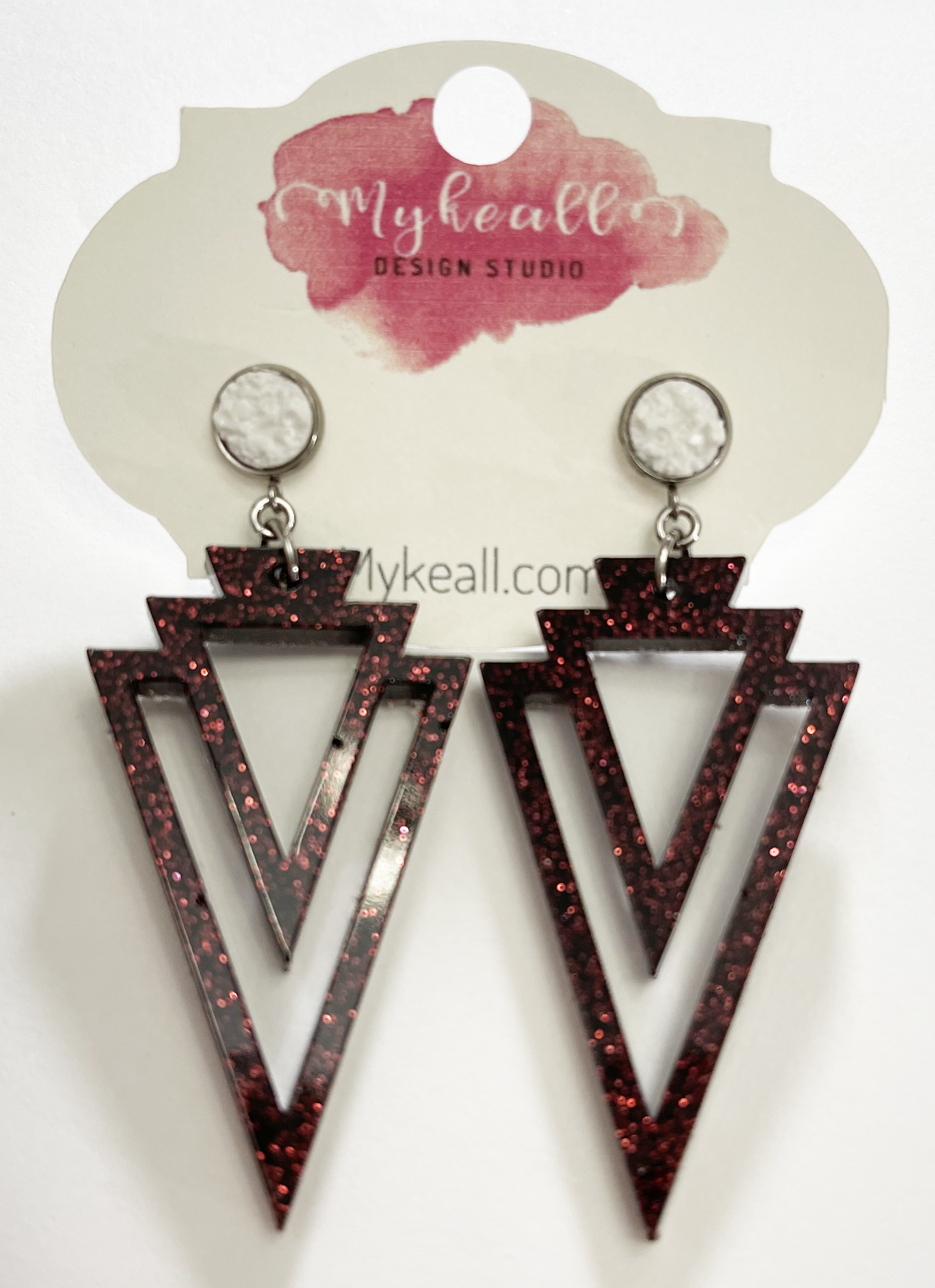 Geometric dangle earrings. Maroon glitter with white druzy post - 2.75" length