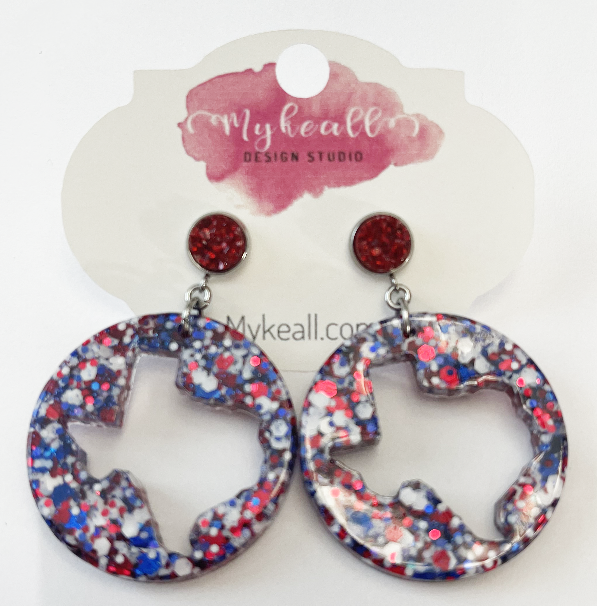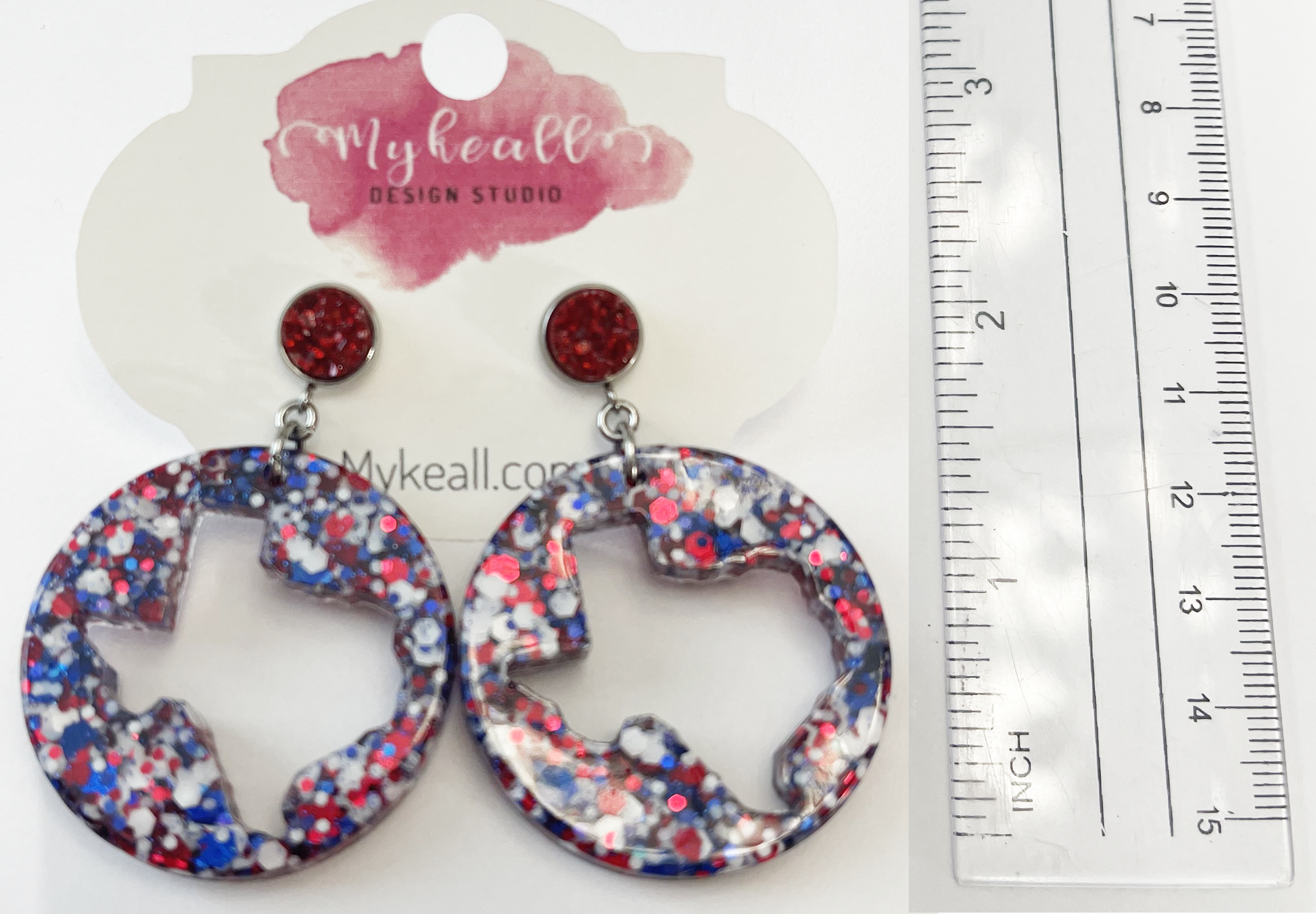 Red white blue glitter Texas cut out dangle earrings with red druzy post - 2" length