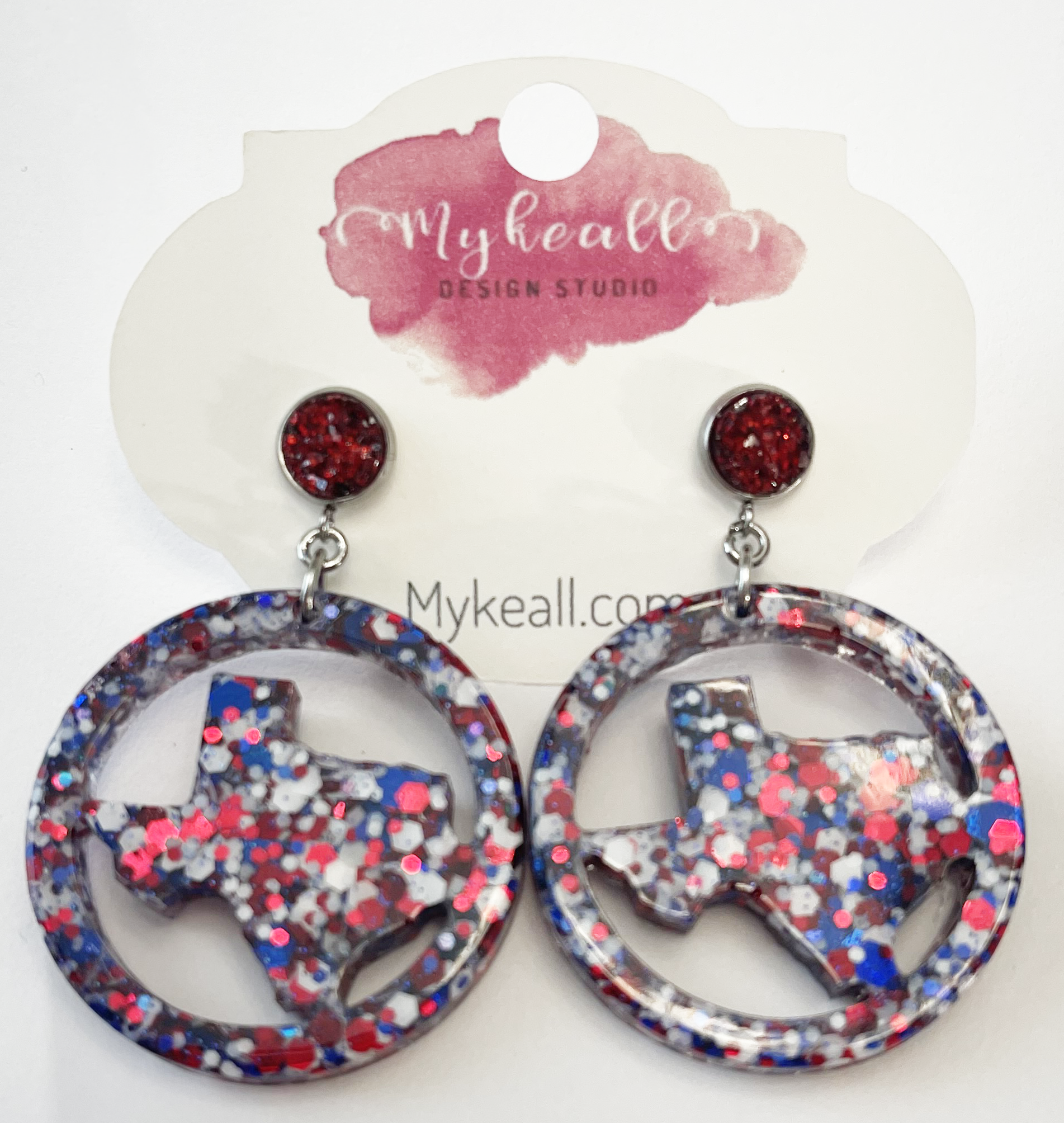 Red white blue glitter Texas dangle earrings with red druzy post - 2" length