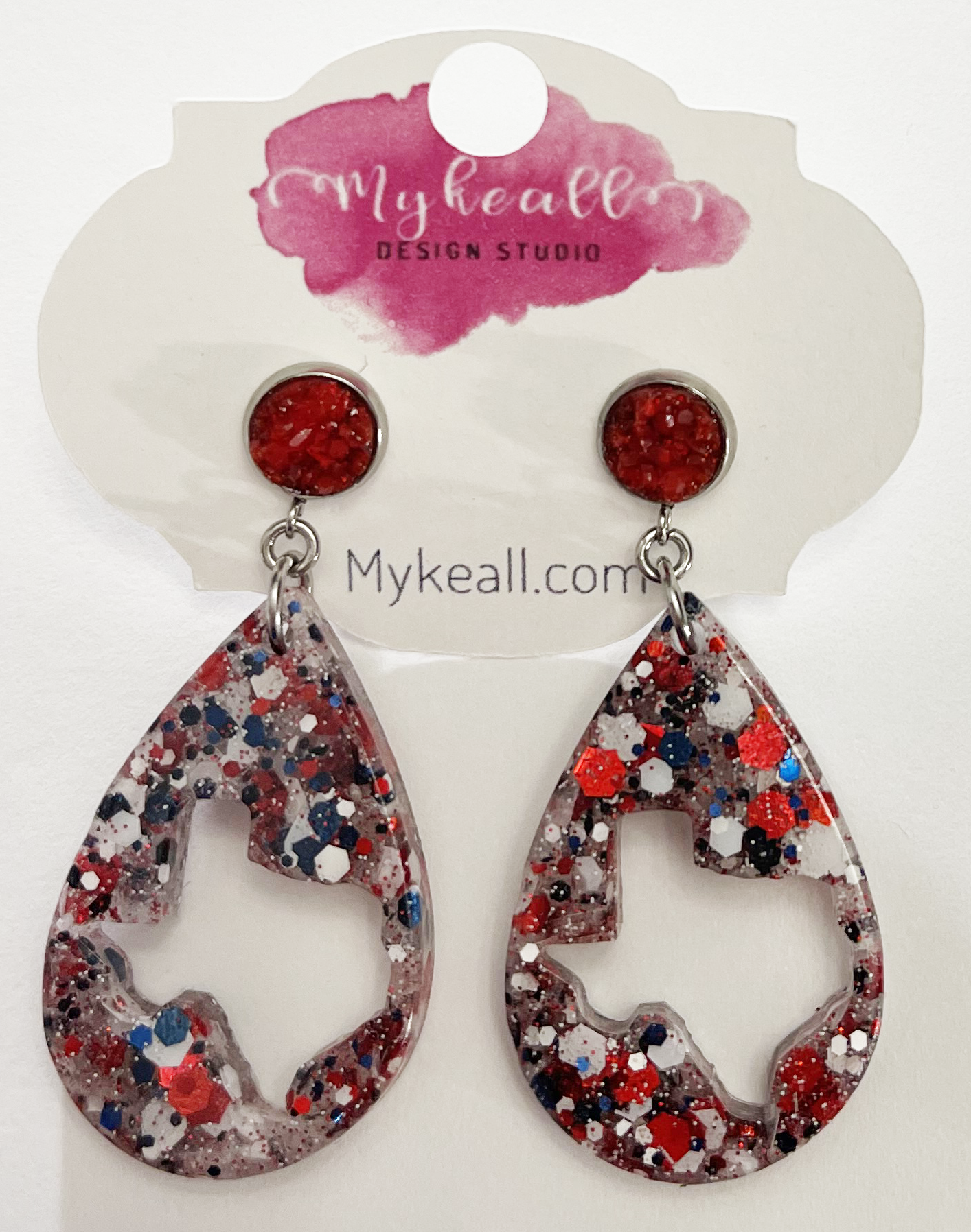Tear drop red white navy glitter Texas earrings with red druzy post - 2" length