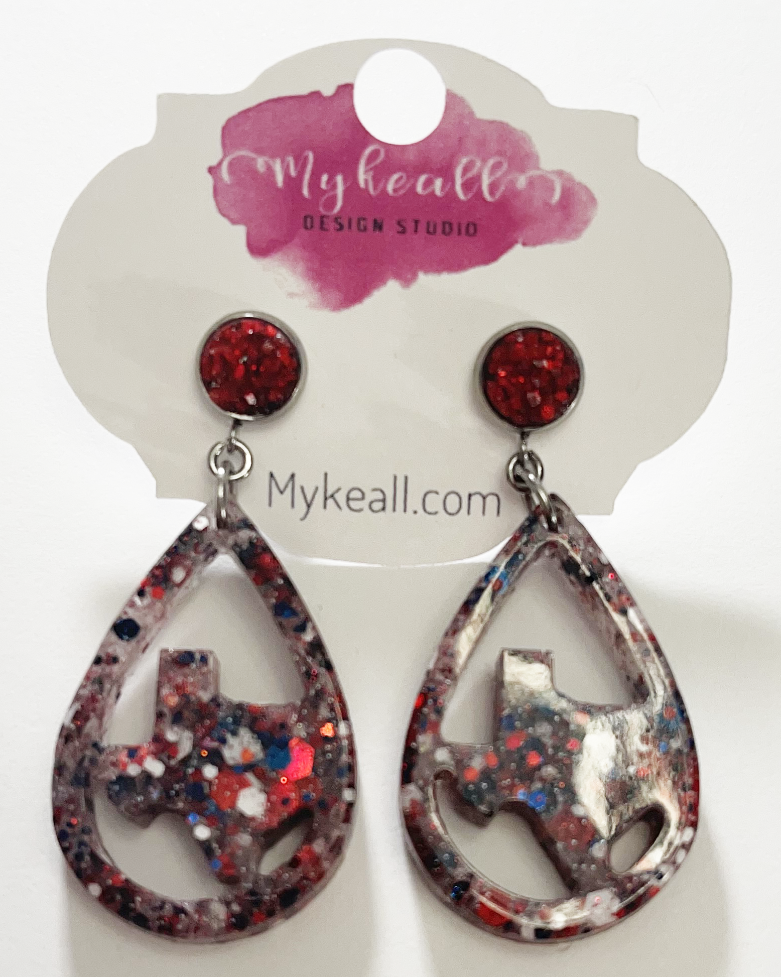 Tear drop red white navy glitter Texas earrings with red druzy post - 2" length