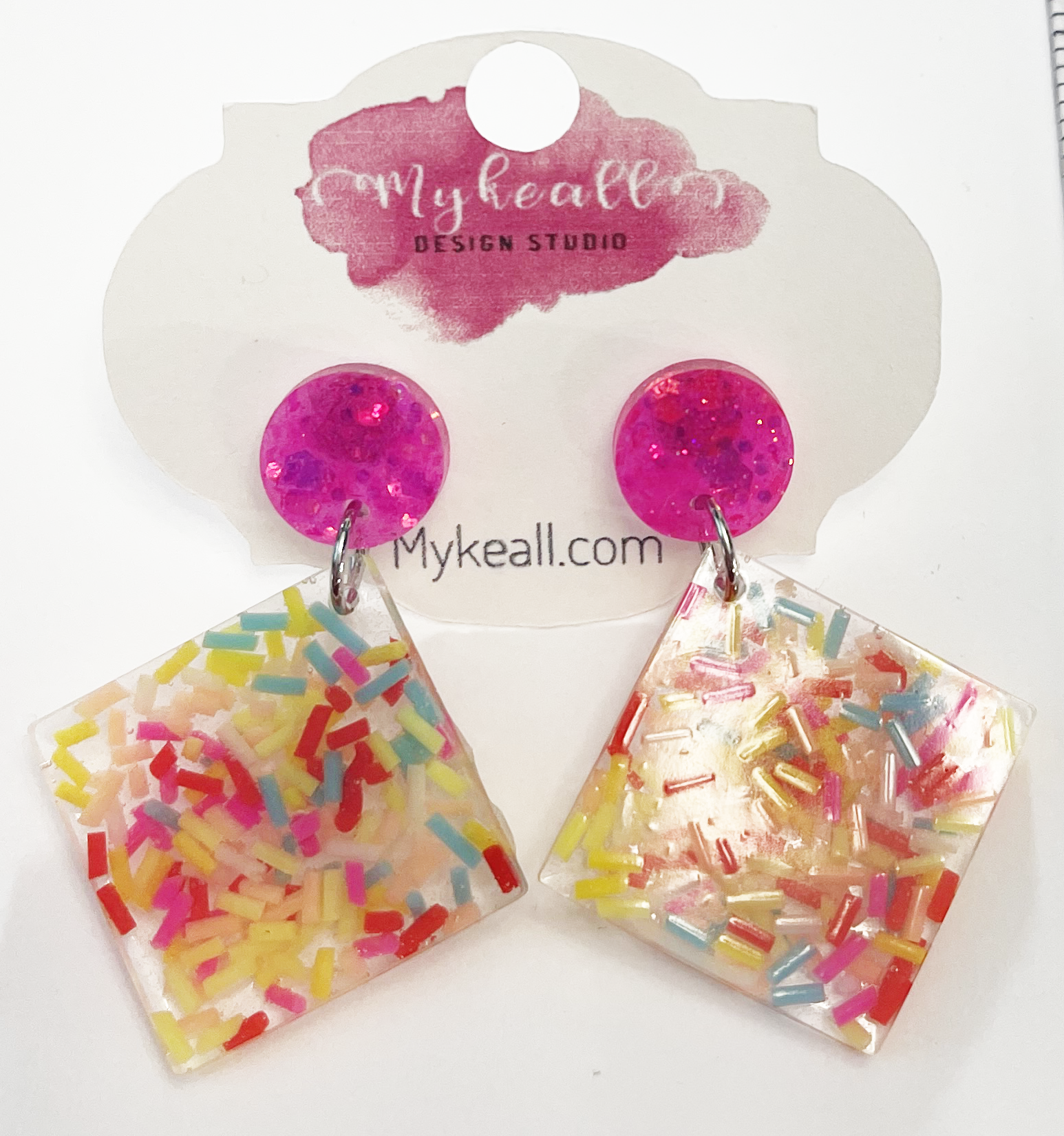 Hand-made epoxy resin earrings with polymer clay sprinkles design!