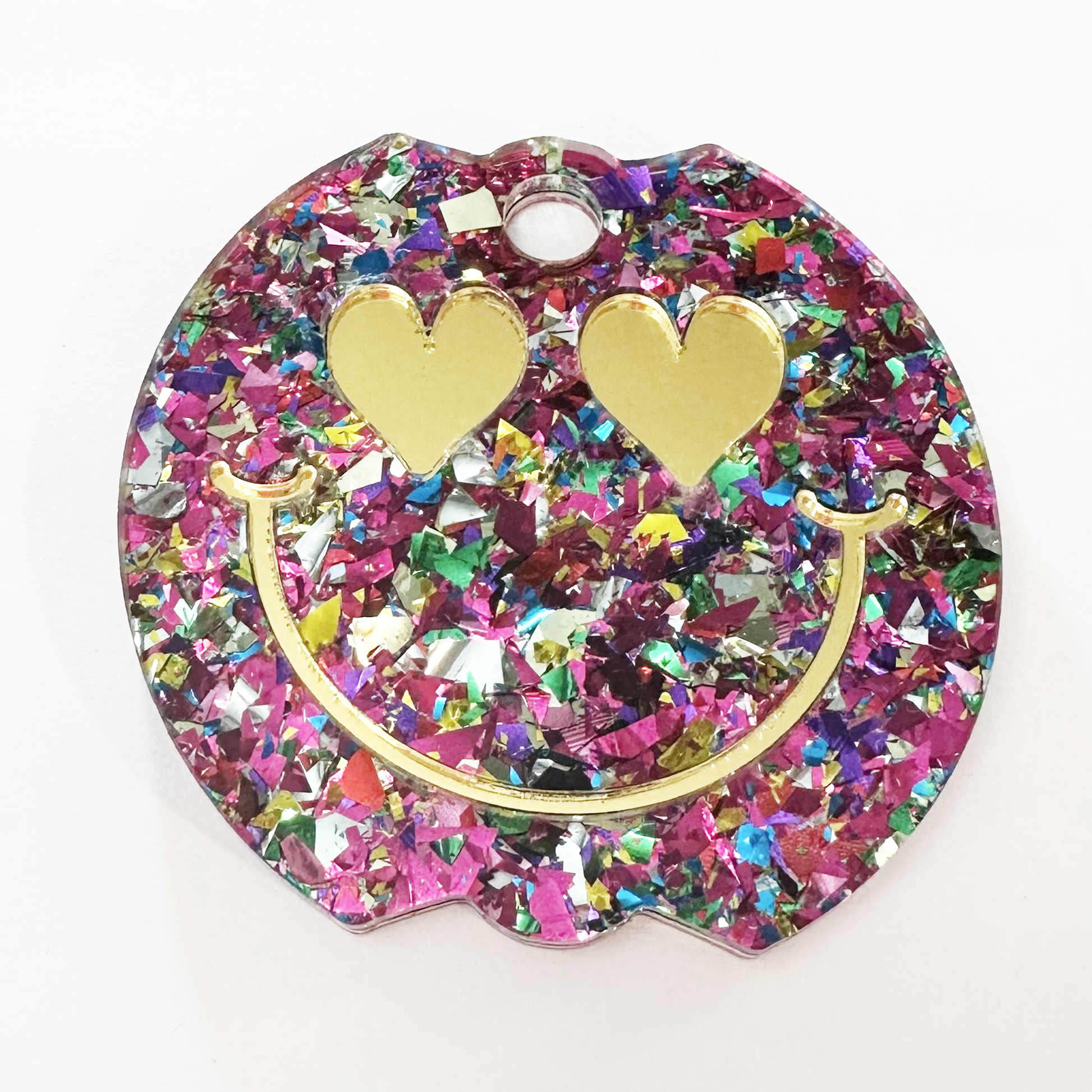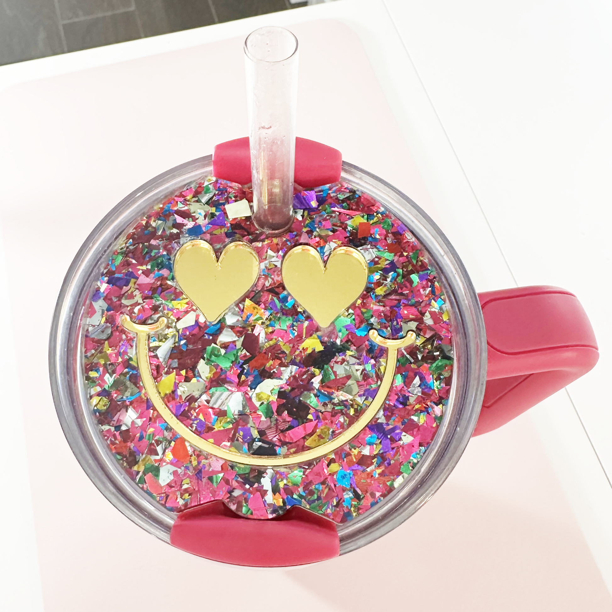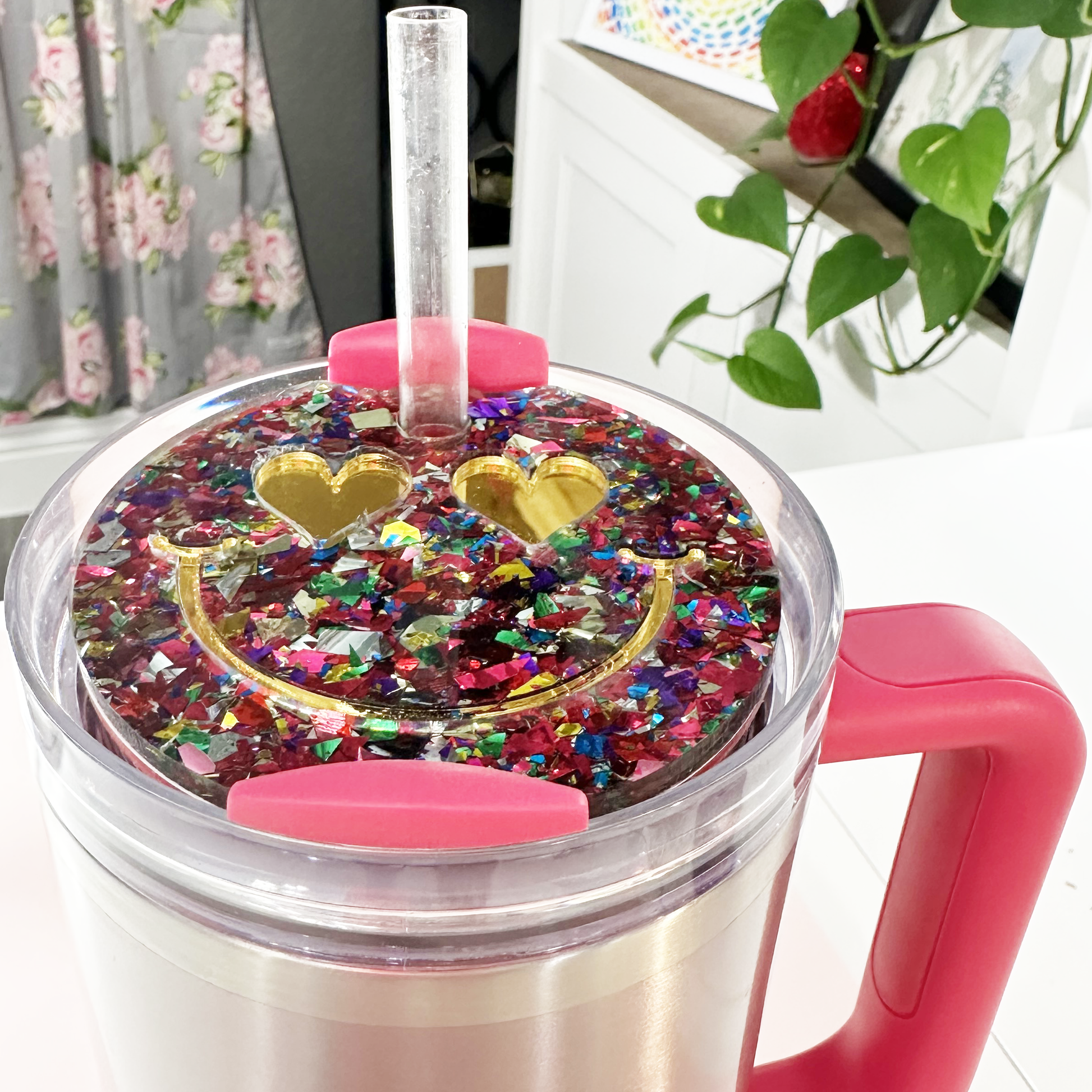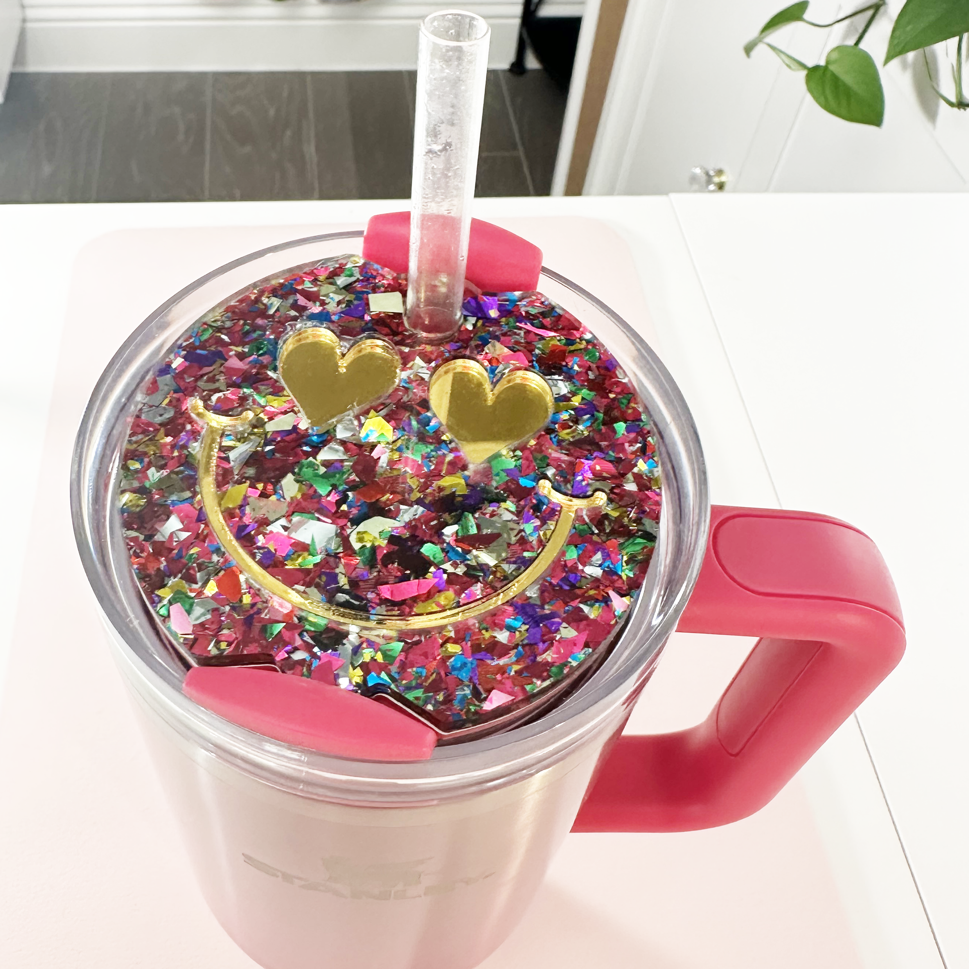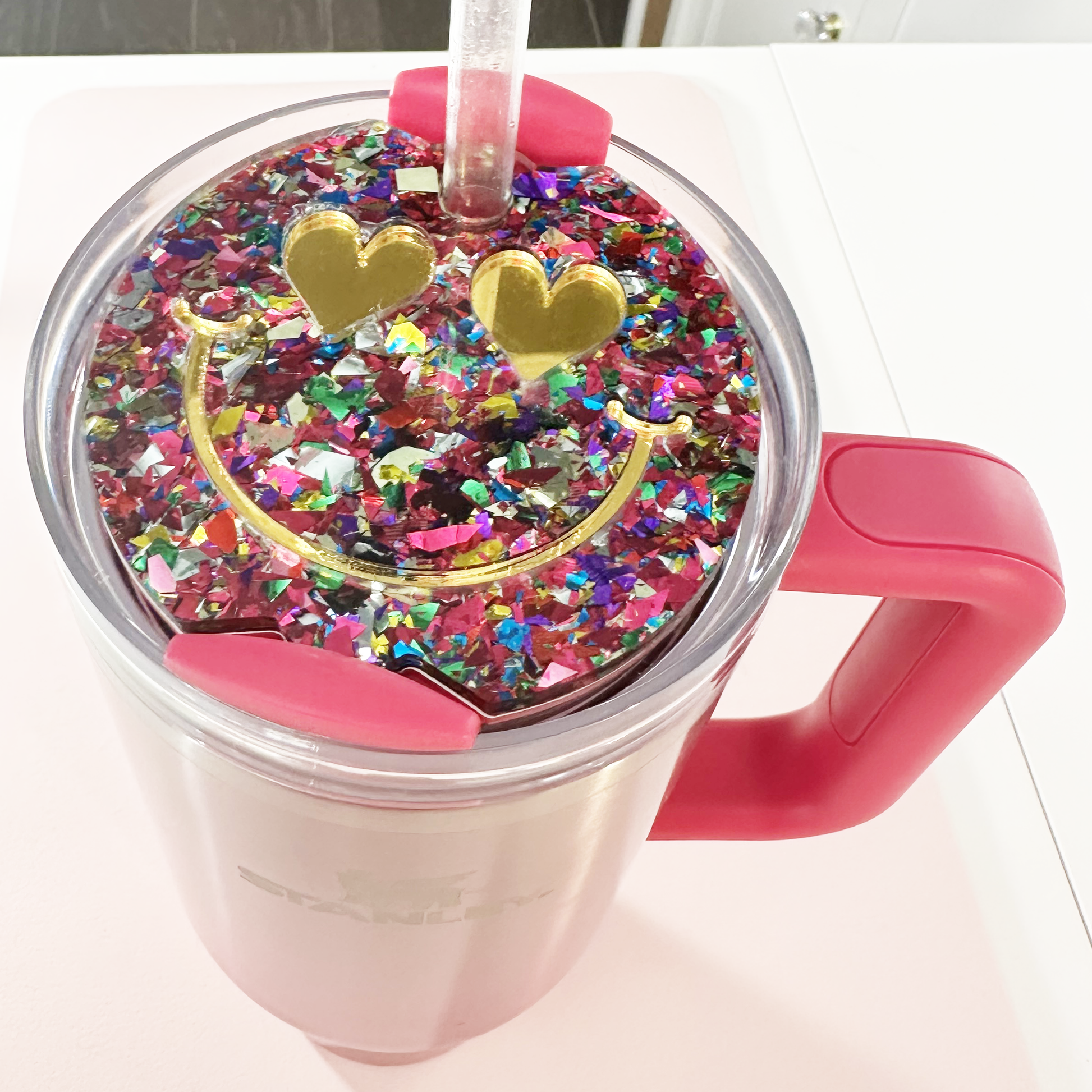 TUMBLER TOPPER -FULL LID - SMILEY FACE-UNICORN CANDY PINK GLITTER