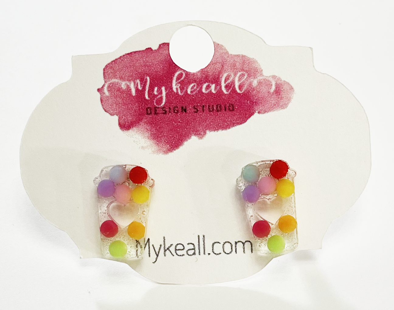 Hand-made resin rainbow confetti dots coffee stud earrings.