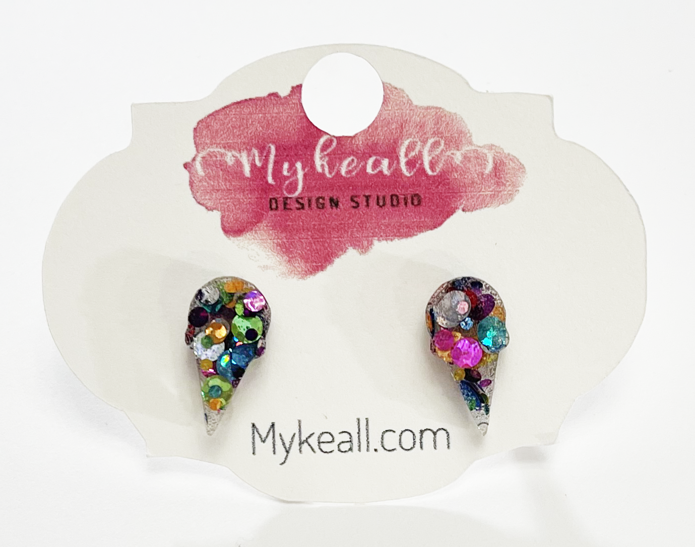 Hand-made resin rainbow glitter ice cream cone stud earrings.