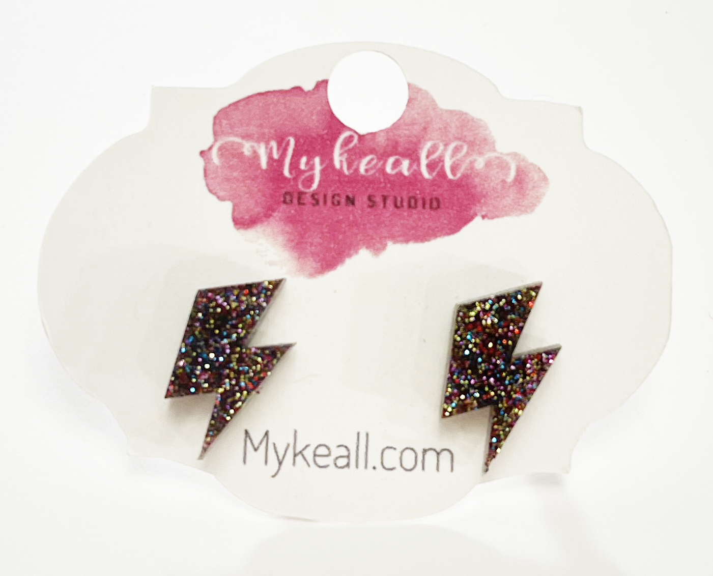 Hand-made resin rainbow holographic glitter lightening bolt stud earrings.