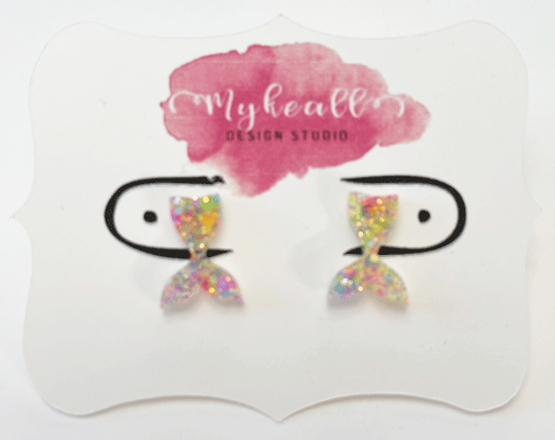 Hand-made resin rainbow glitter mermaid tails stud earrings.
