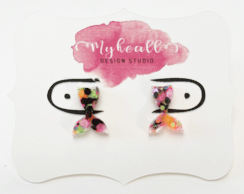 Hand-made resin neon black confetti mermaid tails stud earrings.