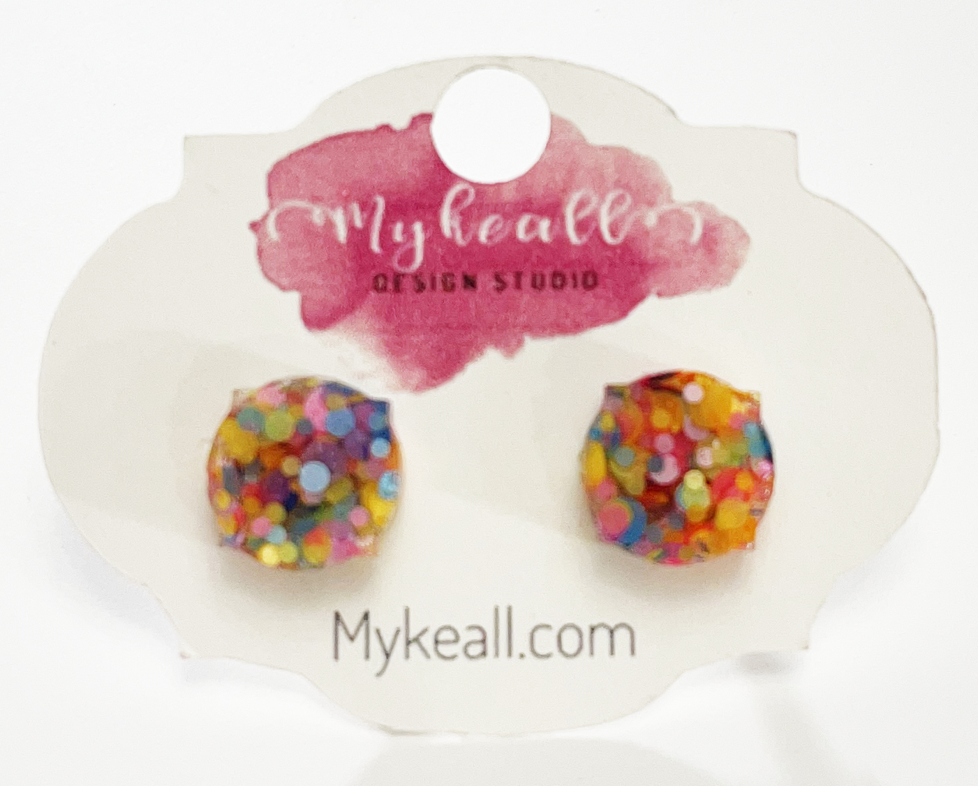Hand-made resin rainbow confetti stud earrings.