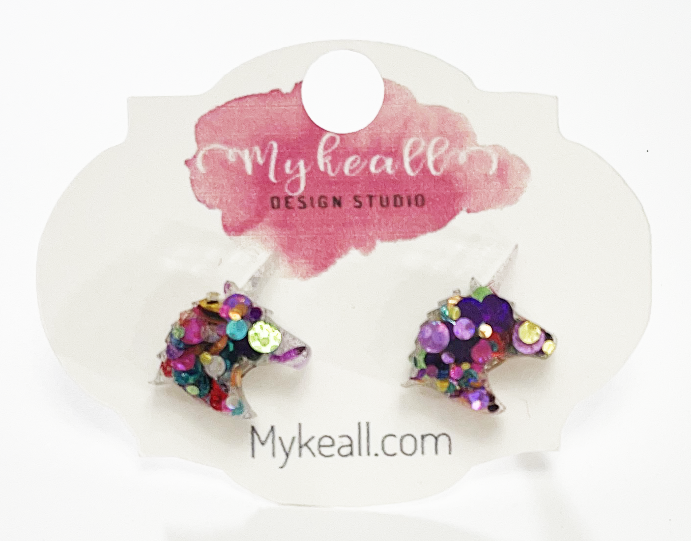 Hand-made resin rainbow glitter unicorn stud earrings.