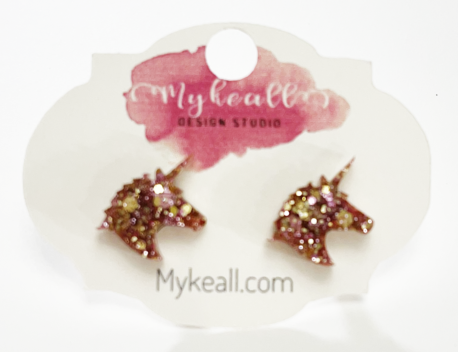 Hand-made resin rose gold glitter unicorn stud earrings.